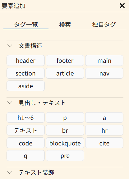 要素追加パネルは、タグ名をキャンバスにドラッグアンドドロップすることで、キャンバスにタグ要素を追加できます。