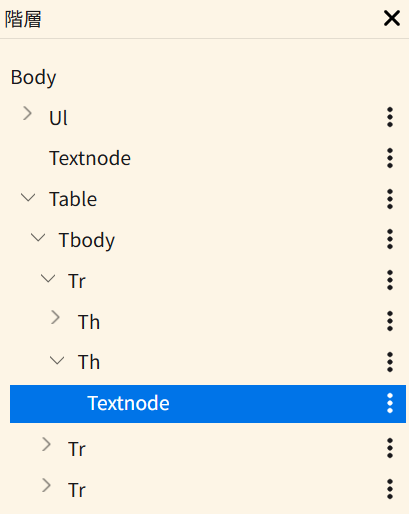 | 後ろに移動 | × | 選択されている要素と、その要素の後方にある要素を入れ替えます。 後方に要素が無いときは、親要素の後方に移動します。 |