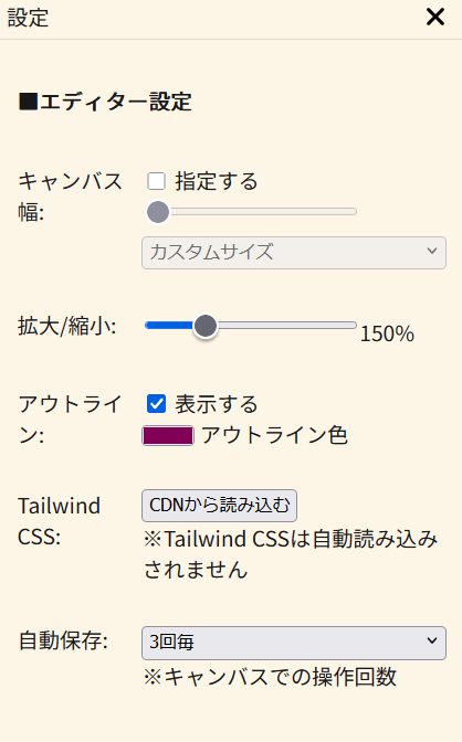 | Tailwind CSS | × | 「CDNから読み込む」を押すと、Tailwind CSSをCDNから読み込みます。 Tailwind CSSを読み込むことで、Tailwind CSSのクラス名を利用できるようになります。 この設定は自動保存されません。次回利用時にTailwind CSSを使用するときは再度、「CDNから読み込む」を押します。 | |