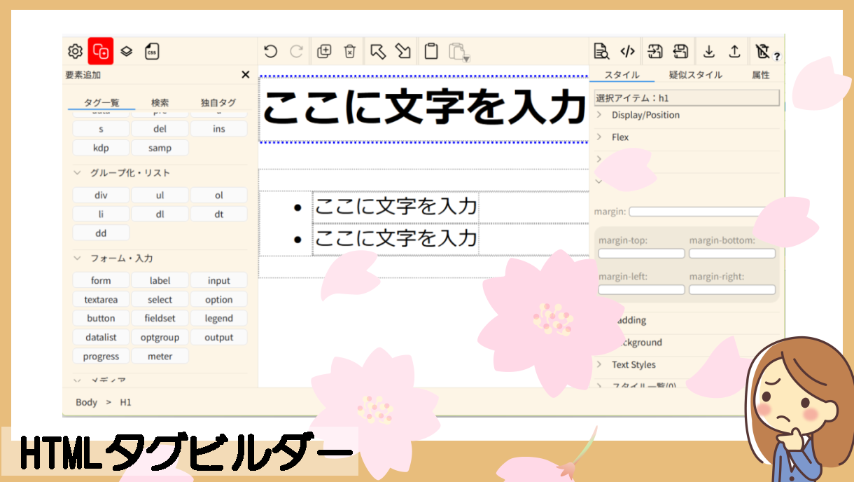 要素追加パネルは、タグ名をキャンバスにドラッグアンドドロップすることで、キャンバスにタグ要素を追加できます。